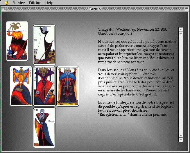 Tarots est le premier vrai logiciel de Tarots de Marseille en français sur macintosh. Alain Bocher a dessiné "Le Tarot de la Réa" qui est inclus dans le logiciel et également les textes d'interprétation.